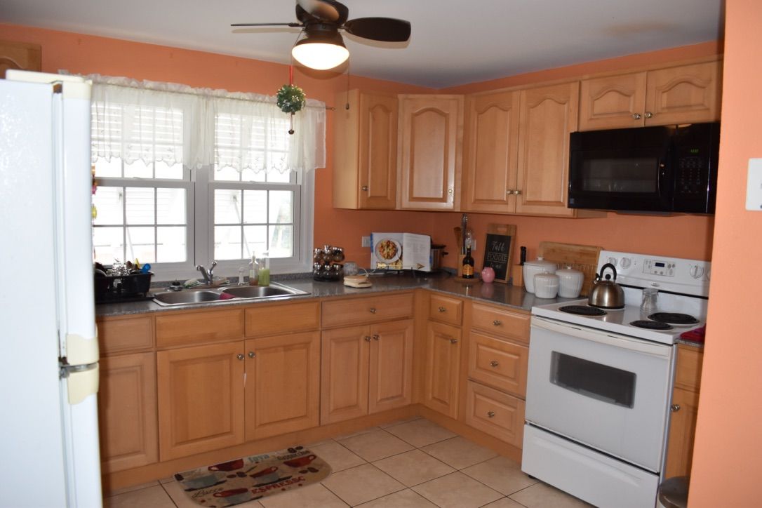 The upper level has both bedrooms, a full bathroom , hallway and the laundry which is very convenient! A nice wide staircase with landing takes you to the lower level that has a well equip kitchen with solid wood cabinets & white appliances, under stairs storage, powder room and an open plan living/dining area which walks out to a private patio.